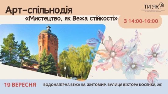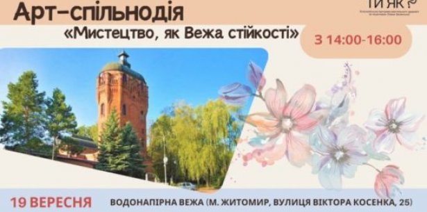 Завтра, 19 вересня, у Житомирі відбудеться унікальна подія – Арт-спільнодія «Творчість – складова нашої стійкості», яка реалізується в рамках всеукраїнської програми ментального здоров’я «Ти як?». Усі охочі можуть завітати на захід за адресою: м. Житомир, вул. Віктора Косенка, 25 (Водонапірна вежа).
