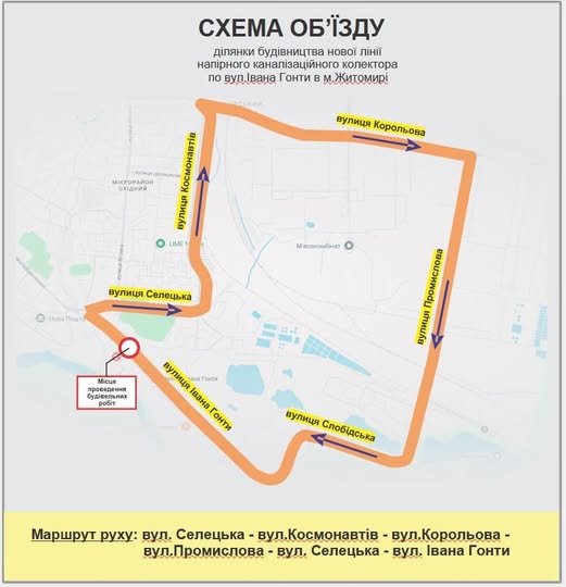 У зазначений період буде здійснено перекриття дорожнього руху у зв’язку із проведенням робіт за об’єктом будівництва нової лінії напірного каналізаційного колектора від ГКНС (по вул. І. Гонти, буд. 16) до КОС-1-КОС-2.