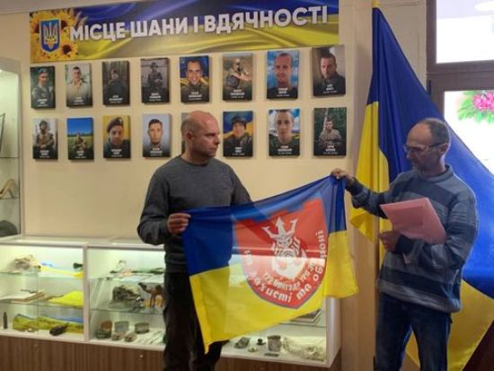 У день відкриття «Музею пам’яті, шани та вдячності» тут з’являється ще один експонат — прапор з логотипом підрозділу, де проходив службу Віталій Скремінський. Стяг із написом “На захисті та обороні” приніс до ліцею рідний брат Захисника. Каже, отримав його від побратимів.