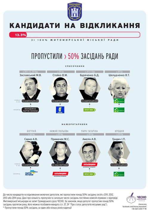 Списочниця від Фронту змін Ольга Пархомчук, яка, за офіційною інформацією міськради була у фракції партії регіонів і потім перейшла в депутатську групу “За наш Житомир”, пропустила понад 50 % засідань комісії і посилається при цьому нібито на норму закону: