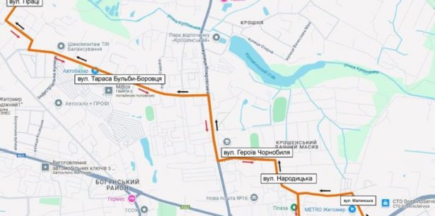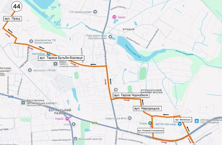 З метою транспортного забезпечення вулиць Праці, Тараса Бульби-Боровця з іншими районами міста Житомира, з 18.12.2024 міський автобусний маршрут № 44 буде продовжений з ринку «Малинський» до вул. Праці згідно наступної схеми: міське кладовище - шосе Західне – вул. Чуднівська – майдан Соборний – вул. Велика Бердичівська – вул. Селецька – вул. Вітрука – вул. Шевченка – вул. Івана Сльоти – вул. Бориса Тена – вул. Східна – вул. Малинська - вул. Народицька (вул. Отаманів Соколовських – просп. Незалежності) – вул. Героїв Чорнобиля – вул. Покровська – Тараса Бульби-Боровця – вул. Бялика – вул. Праці.