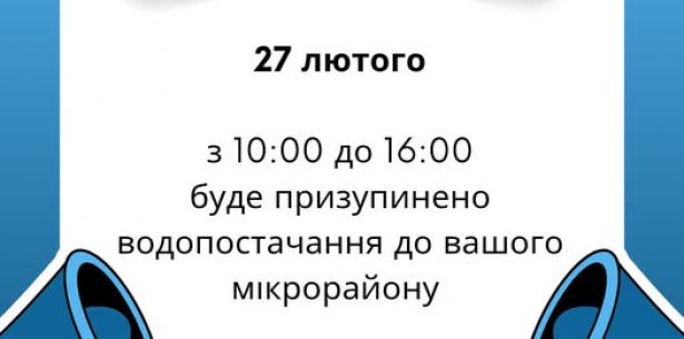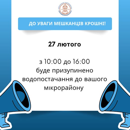 КП "Житомирводоканал" повідомляє, що 27 лютого з 10:00 до 16:00 водопостачання буде повторно призупинене до мікрорайону Крошня.