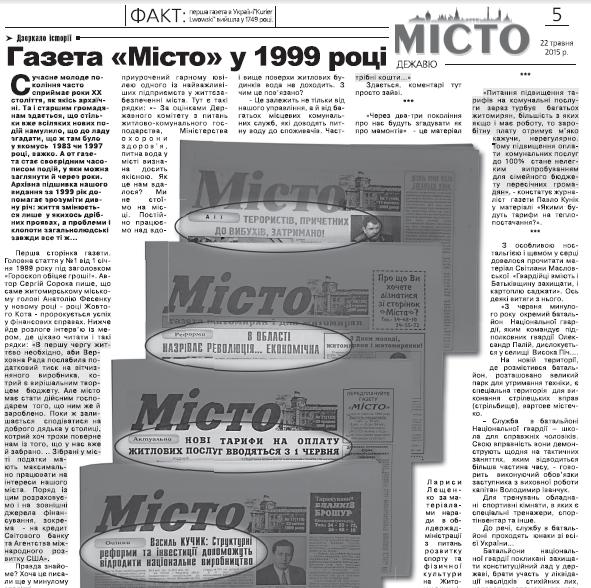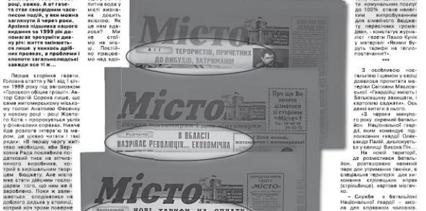 Перша сторінка газети. Головна стаття у №1 від 1 січня 1999 року під заголовком «Гороскоп обіцяє гроші!». Автор Сергій Сорока пише, що саме житомирському міському голові Анатолію Фесенку у новому році - році Жовтого Кота - пророкується успіх у фінансових справах. Нижче йде розлоге інтерв’ю із мером, де цікаво читати і такі рядки: «В першу чергу життєво необхідно, аби Верховна Рада послабила податковий тиск на вітчизняного виробника, котрий є вирішальним творцем бюджету. Але місто має стати дійсним господарем того, що ним же й зароблено. Поки ж залишається сподіватися на доброго дядька у столиці, котрий хоч трохи поверне нам із того, що у нас вже й забрано. .. Зібрані у місті податки мають максимально працювати на інтереси нашого міста. Поряд із цим розраховуємо і на зовнішні джерела фінансування, зокрема - на кредит Світового банку та Агентства міжнародного розвитку США».
