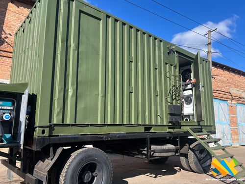 «Каналізація, вода, нагрів води, освітлення… Це все встановлювали ми. Чим цікавий модуль: він використовує дизельний інвекторний генератор потужністю 10 кіловат. Це якісне живлення, яке дає змогу гарно працювати двом «пралкам» та двом «сушкам», насосу, системі підігріву води від ТЕНа. Є можливість підігріву води від бойлера, який працює на дровах. Також, дизель — це економія».